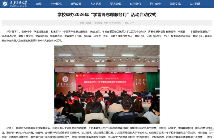校團(tuán)委高度重視,結(jié)合學(xué)校年度工作要點(diǎn)與育人實(shí)際,于3月5日印發(fā)《關(guān)于開(kāi)展2026年“學(xué)雷鋒志愿服務(wù)月”活動(dòng)的通知》(西石大團(tuán)發(fā)〔2026〕3號(hào)),對(duì)全年特別是3月份的學(xué)雷鋒志愿服務(wù)工作進(jìn)行了系統(tǒng)安排。《通知》明確了“服務(wù)重大戰(zhàn)略、踐行為民宗旨、深入基層治理、融匯學(xué)科優(yōu)勢(shì)、厚植校園沃土”五大活動(dòng)方向,為全?;顒?dòng)開(kāi)展提供了清晰指引。各院(系)團(tuán)委、各級(jí)學(xué)生組織迅速響應(yīng),結(jié)合學(xué)科專業(yè)特色,制定了具體可行的實(shí)施方案,形成了校院聯(lián)動(dòng)、分工明確、責(zé)任到人的工作格局,確保了各項(xiàng)活動(dòng)有計(jì)劃、有步驟地扎實(shí)推進(jìn)。