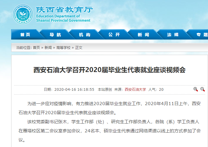 為進一步應對疫情影響,有力推進2020屆畢業(yè)生就業(yè)工作,2020年4月11日上午,西安石油大學召開2020屆畢業(yè)生代表就業(yè)座談視頻會。