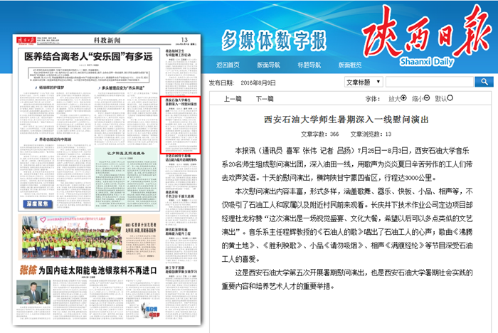 本報訊(通訊員 趙喜軍 張偉 記者 呂揚)7月25日—8月3日,西安石油大學音樂系20名師生組成慰問演出團,深入油田一線,用歌聲為炎炎夏日辛苦勞作的工人們帶去歡聲笑語。十天的慰問演出,橫跨陜甘寧蒙四省區(qū),行程達3000公里。