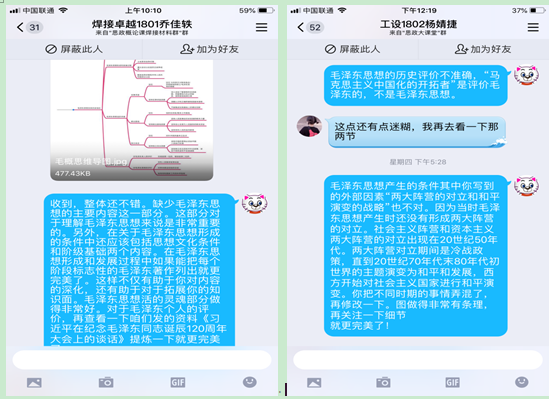 授課中,按照教學(xué)規(guī)劃,她精心選擇和使用教學(xué)案例。如對毛澤東思想主要內(nèi)容的學(xué)習(xí)時,除指導(dǎo)學(xué)生完成教材內(nèi)容的學(xué)習(xí)外,結(jié)合當(dāng)前的國家局勢,特別增加了毛澤東在1949814日到916日發(fā)表的五篇文章,讓學(xué)生通過對文獻(xiàn)的閱讀,進(jìn)一步思考毛澤東的論述對當(dāng)今處理中美關(guān)系的啟示。授課中采用“學(xué)習(xí)通+群課堂”的教學(xué)模式,學(xué)生在學(xué)習(xí)通完成基本知識點(diǎn)的學(xué)習(xí),群課堂完成教學(xué)重難點(diǎn)的講解,將學(xué)生的自主學(xué)習(xí)和教師的主導(dǎo)性相結(jié)合,增強(qiáng)了師生互動。授課中還通過設(shè)定靈活多樣的討論題,激發(fā)學(xué)生的思考。如學(xué)完毛澤東思想的內(nèi)容,讓學(xué)生結(jié)合所學(xué)內(nèi)容,談?wù)勑哪恐械拿珴蓶|;如看完教育部社科司組織的“疫情防控思政大課”讓學(xué)生談?wù)勛约旱捏w會。通過與學(xué)生的互動交流,逐步引導(dǎo)學(xué)生要用“四個自信”明心立志,引導(dǎo)學(xué)生把愛國情、強(qiáng)國志、報(bào)國行融入新時代的追夢征程中。