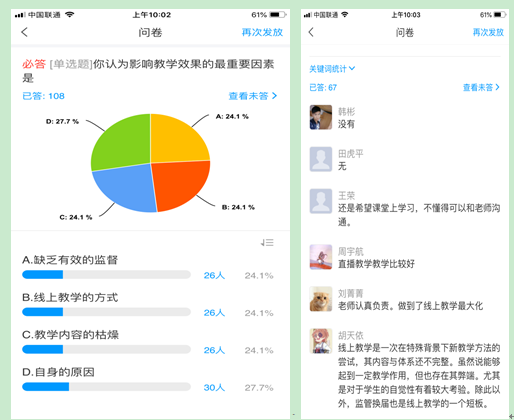 授課中郭艷英老師隨時關(guān)注學(xué)生。根據(jù)兩周線上教學(xué)的在線調(diào)查,郭老師依據(jù)學(xué)生的反饋及時調(diào)整自己的教學(xué)方法。如51%的學(xué)生認(rèn)為影響教學(xué)效果的重要因素為缺乏有效監(jiān)督和自身原因時,郭老師采用了隨機(jī)抽查的方式加大督查力度,針對自律性特別差的同學(xué),采用打電話、發(fā)QQ等方式提醒督促,保證不讓一個學(xué)生掉隊(duì)。