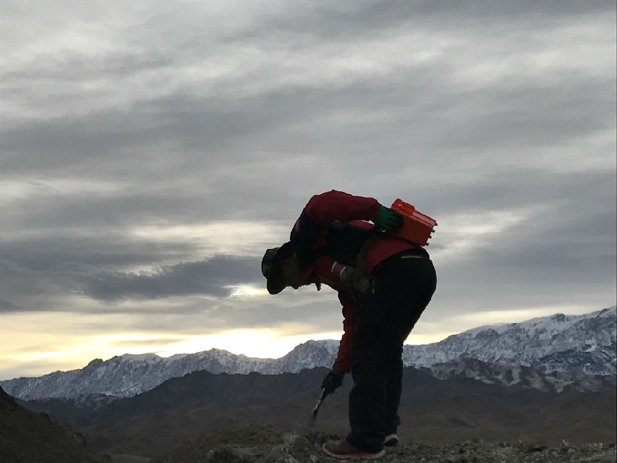 2014年是他工作的第一年,7、8月份的新疆哈密戈壁灘上正是烈日炙烤大地正旺的時(shí)候,熱浪滾滾,沙子都可以把雞蛋燙熟。他和隊(duì)友頭頂著炎炎烈日,踏著灼熱砂礫,扛著重力儀攀爬一個(gè)又一個(gè)沙丘。日出而作,在無(wú)垠的戈壁中一次一次按下儀器按鍵,餓了啃口饅頭,渴了喝口白開水。完成一天的野外工作任務(wù),輾轉(zhuǎn)回到項(xiàng)目駐地,已是晚上8點(diǎn),日頭還是那么毒,汗水已經(jīng)把衣服浸透了,第一次出野外的他開始想念家人。